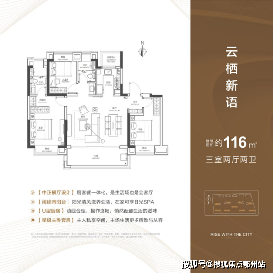 整体来看,116m²亮点颇多。U型厨房,抽拉式水龙头,西门子厨具,洗切烹动线流畅;独立玄关入户,家庭公区收展一体化;北侧全飘窗设计,公卫干湿分离,主卧套间,宽景阳台面宽约5米8,进深约1米8。